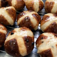 - When the buns are ready, brush the glaze over the buns whilst hot and leave to cool.