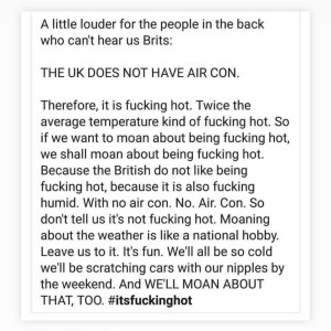 If you have had any interactions, however fleeting, with any British people in the last week you will know we’ve been having a heatwave. We won’t have been able to not mention it. For anyone not familiar with our weather and why this is a particular issue I think this sums it up nicely.